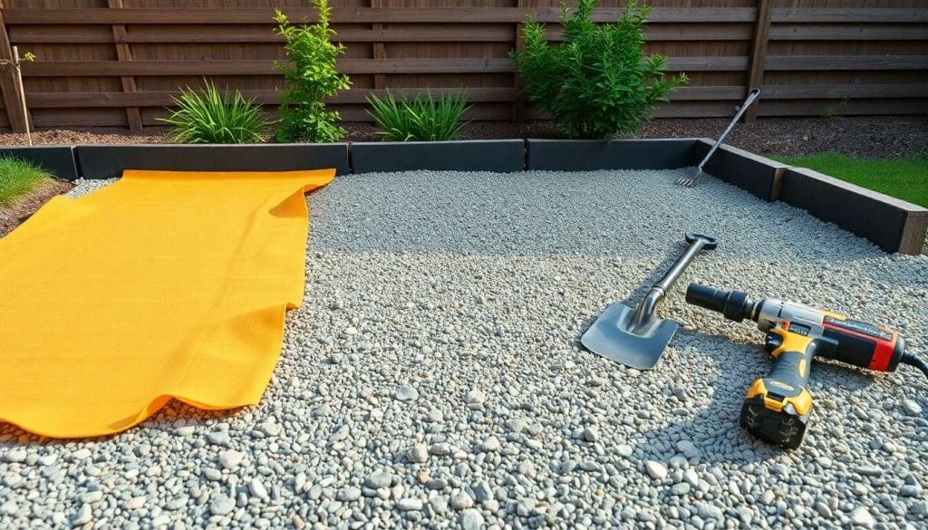 répartissez uniformément le gravier sur l’ensemble de la surface en vous aidant du râteau. nivelez pour obtenir une surface lisse.